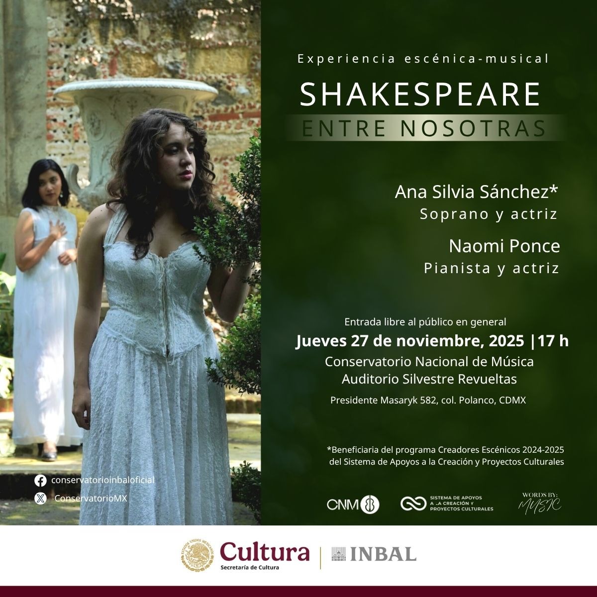 La Secretaría de Cultura del Gobierno de México y el Instituto Nacional de Bellas Artes y Literatura (INBAL), a través de la Subdirección General de Educación e Investigación Artísticas (SGEIA) y el Conservatorio Nacional de Música (CNM), presentan Shakespeare entre nosotras, una experiencia escénico-musical que fusiona la literatura con la música de cámara.