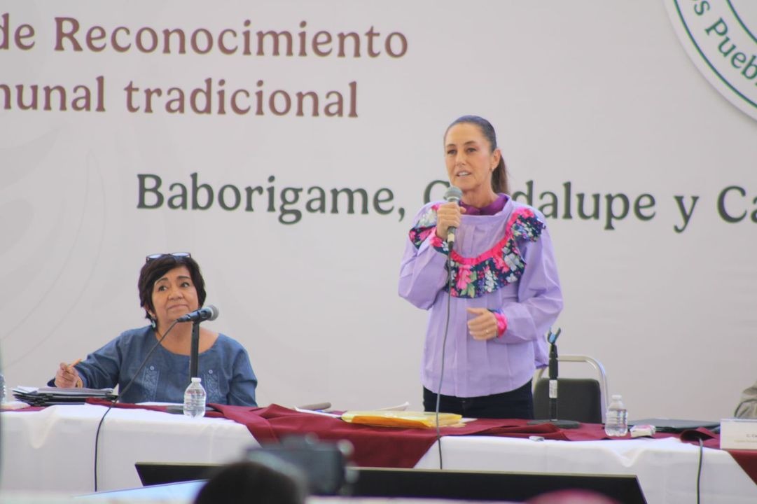 Antes del acto oficial, participó en una ceremonia tradicional indígena previa al acto oficial, en la que mujeres de los pueblos originarios la ataviaron con prendas típicas y le entregaron un bastón de mando. Acompañada por autoridades tradicionales rarámuri, ódami y tepehuano, así como por habitantes de diversas comunidades serranas, firmó dos decretos que restituyen 820 hectáreas a comunidades indígenas: 502.3 hectáreas a la comunidad ódami de Mesa Colorada y 317.9 a la comunidad rarámuri de Mogótavo.
