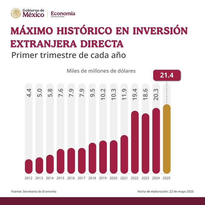 Era jueves 22 de mayo y en medio de una guerra arancelaria que sigue escalando, y de un Donald Trump que no ha dejado de tratar a México como piñata, la presidenta Claudia Sheinbaum decidió difundir una cifra para confirmar la confianza del mundo en su administración: México recibió 21.4 mil millones de dólares en inversión extranjera directa (IED) durante el primer trimestre de 2025, una “cifra histórica”, presumió.