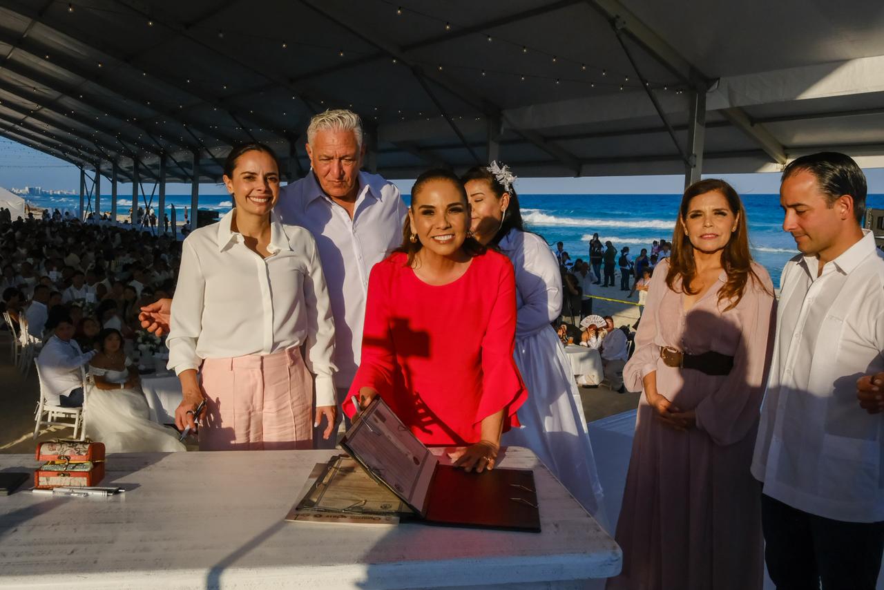 Cancún.- En un ambiente festivo frente al mar Caribe, 357 parejas contrajeron matrimonio civil durante las Bodas Colectivas 2026, celebradas en Playa Delfines y atestiguadas por la gobernadora Mara Lezama Espinosa, la presidenta honoraria del DIF, Verónica Lezama Espinosa y la presidenta municipal Ana Paty Peralta.