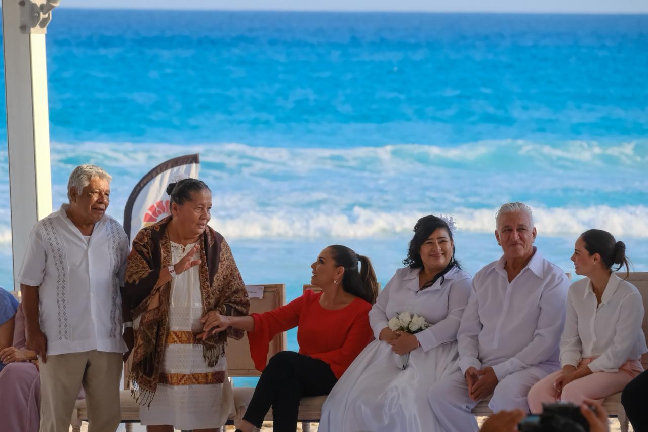 En el mensaje que dirigió a las y los contrayentes, la gobernadora Mara Lezama recordó que cuando fue presidenta municipal de Benito Juárez decidió que las bodas colectivas se hicieran en la playa, frente al mar, pues las playas son de todos y no de unos cuantos.