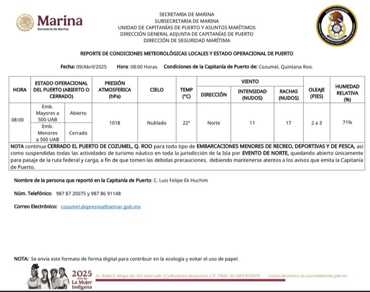Sinopsis Meteorológica: Masa de Aire modificada localizada al norte del Golfo de México, afecta la Península de Yucatán nos trae un ligero descenso en las temperaturas con vientos del noroeste y norte durante la mañana, fiándose al norte y noreste por la tarde noche de 27 a 36 con tachas de 50 kph y oleaje sobre la rada de Cozumel.