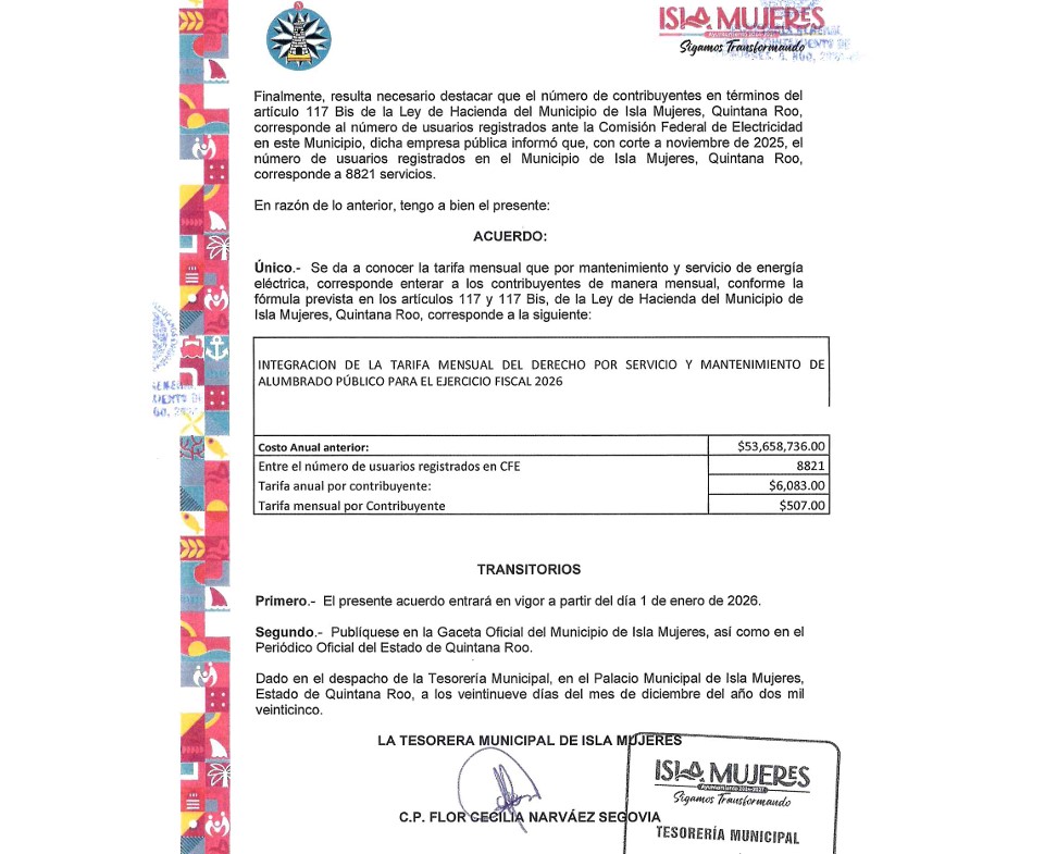 CHETUMAL, 8 de enero.- La alcaldesa de Isla Mujeres, Atenea Gómez Ricalde, mediante su representante legal, presentó un escrito de réplica al Diario CAMBIO 22 sobre la nota que da a conocer la tarifa establecida para el cobro del Derecho de Alumbrado Público en el 2026, y sostiene que no es una burla a la resolución de la Suprema Corte de Justicia de la Nación (SCJN) sobre su anterior esquema de cobro, que se aplicará un modelo de cobro diferente, que no se excluye a los usuarios sin contrato con la Comisión Federal de Electricidad (CFE) y que ahora el 5 % de la facturación del consumo eléctrico privado servirá como límite máximo para el cobro del derecho en recibos de luz.