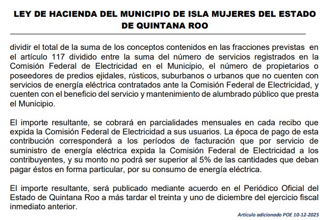La alcaldesa de Isla Mujeres señala que “la nota sugiere que se ‘excluye’ a quienes no tienen contrato de la Comisión Federal de Electricidad. Esa conclusión no es correcta: la propia ley prevé que, cuando una persona propietaria o poseedora no cuenta con contrato, el cobro se realice por otros medios, por ejemplo, junto con el impuesto predial o mediante pagos diferidos ante Tesorería. Por eso, puede confundirse el ‘canal de cobro’ con la existencia de la obligación”.
