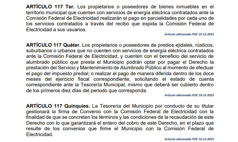 No obstante, la exclusión que refiere la nota no es que no se obligue al pago a los propietarios sin contrato con la CFE, sino que la Tesorería Municipal excluyó el número de esos propietarios de la base de contribuyentes entre la que dividió el costo real del servicio de alumbrado público, en la fórmula para calcular la tarifa publicada el 31 de diciembre de 2025.