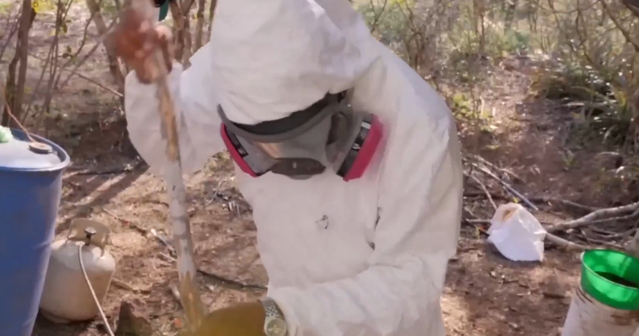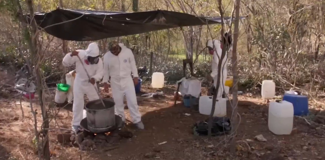 En la cocina clandestina, mezclan precursores químicos con ácido y disolventes, luego prensan la mezcla en tabletas y las envasan para exportación, una tabla atascada en la prensa genera tensión, los hombres temen que los vigilantes de la sierra avisen por radio la llegada de una patrulla militar.