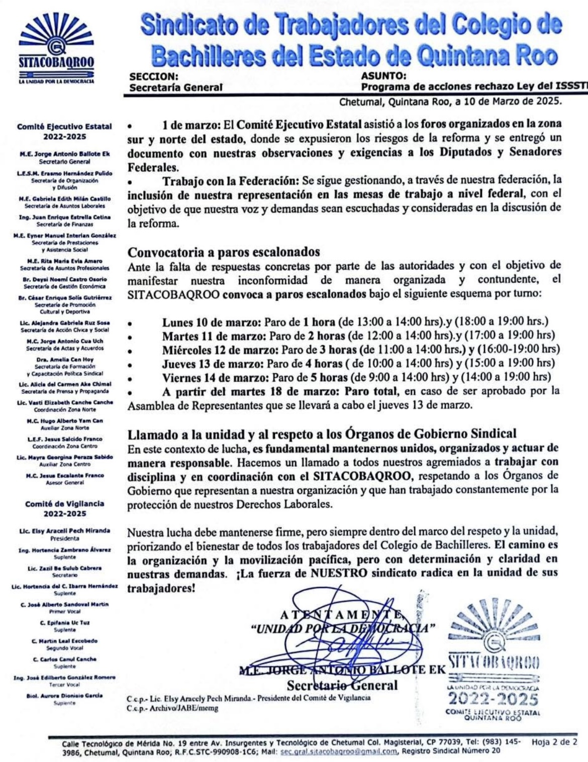 Sindicato del Colegio de Bachilleres de Quintana Roo Convoca a Paros Escalonados de Labores en Rechazo de la Reforma de la Ley del ISSSTE