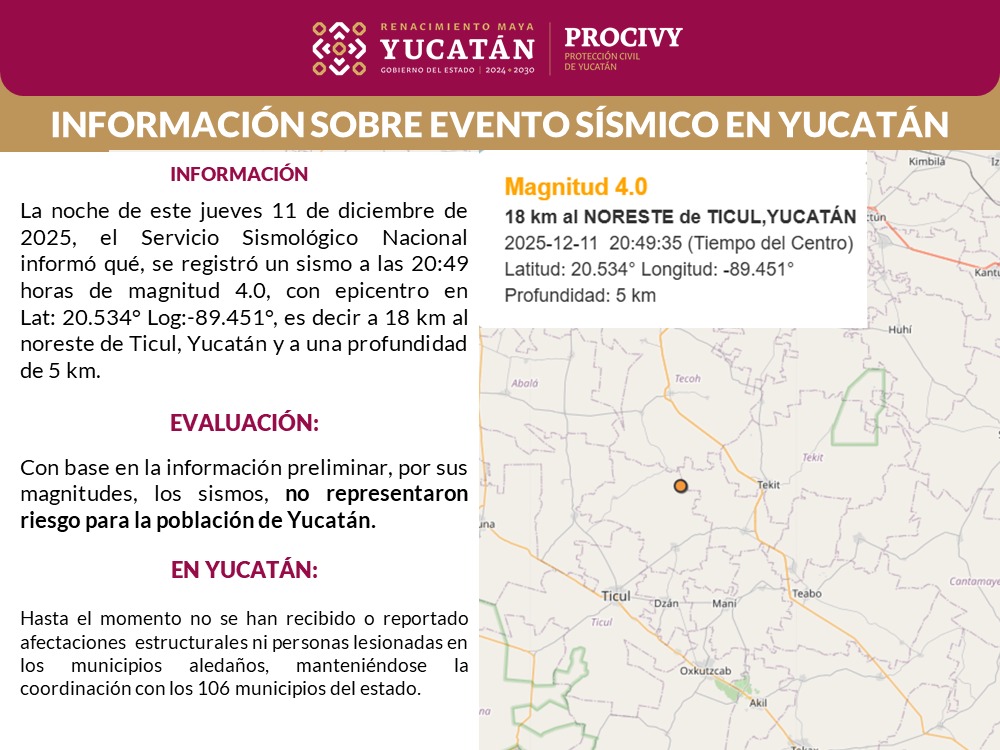 La noche de este jueves 11 de diciembre, el Servicio Sismológico Nacional (SSN) informó sobre el registro de un sismo de magnitud 4.0 ocurrido a las 20:49 horas, con epicentro localizado a 18 kilómetros al noreste del municipio de Ticul, en el estado de Yucatán.
