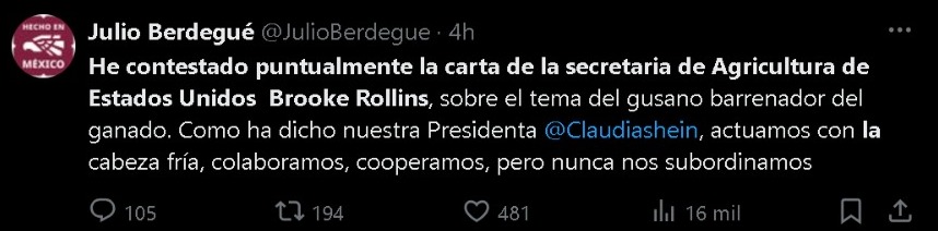 “He contestado puntualmente la carta de la secretaria de Agricultura de Estados Unidos Brooke Rollins, sobre el tema del gusano barrenador del ganado. Como ha dicho nuestra presidenta Claudia Sheinbaum, actuamos con la cabeza fría, colaboramos, cooperamos, pero nunca nos subordinamos. Así, estoy seguro que llegaremos a buenos acuerdos”, escribió en su cuenta de X.