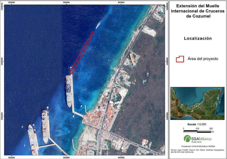 Específicamente, el proyecto contempla la construcción de un nuevo duque de alba, y como su nombre lo indica la extensión del muelle actual dentro de la zona federal marítima de la Terminal, ubicada en la zona sur de la ciudad de San Miguel de Cozumel.