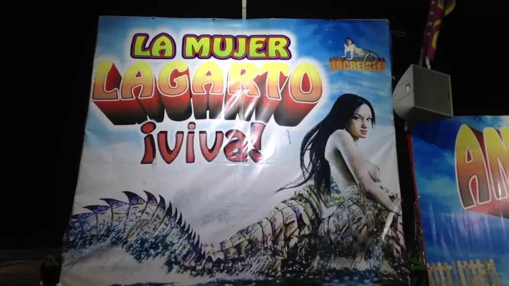 Oxkuztcab, Yuc., a 10 de diciembre de 2024. Durante la Feria de la Naranja en Oxkutzcab, la dueña de la atracción “La mujer lagarto” sufrió un infarto.
