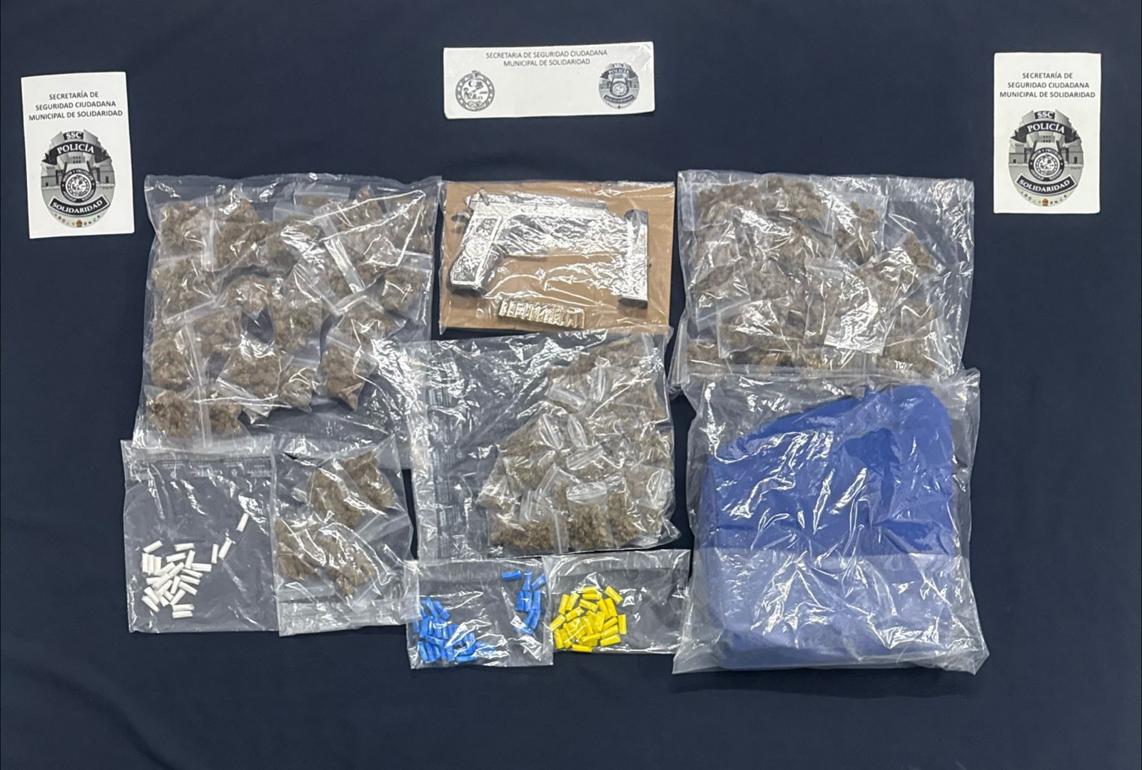 Elementos de la policía municipal realizaban un recorrido de prevención del delito cuando observaron a un individuo que manipulaba bolsitas plásticas con características de narcóticos. Al realizar una inspección, aseguraron 177 envoltorios con características de posible marihuana, cristal, piedra y cocaína, además de un arma de fuego y 12 cartuchos.