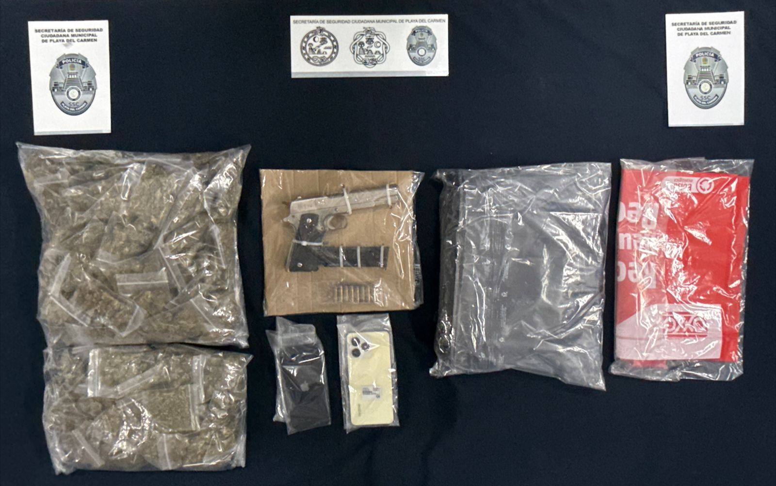 Playa del Carmen, a 20 de mayo de 2025.- La Secretaría de Seguridad Ciudadana de Playa del Carmen aseguró a dos personas por presuntos delitos contra la salud y violación a la Ley Federal de Armas de Fuego y Explosivos en el fraccionamiento Villas del Sol.