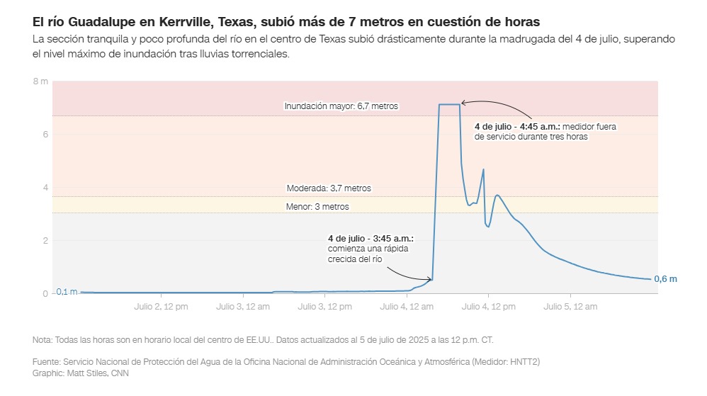 Las mediciones del nivel del agua a lo largo de partes del río Guadalupe, cerca de la comunidad de Hunt, en el condado Kerr, “indican que una gran y mortal ola de inundación se está moviendo río abajo”, advirtió el NWS. El río creció 6,7 metros en tan solo tres horas y alcanzó su segundo nivel más alto registrado la madrugada del viernes. Unas horas más tarde, el medidor de río que registró esa crecida resultó dañado y quedó fuera de servicio como consecuencia de las inundaciones, según el Servicio Meteorológico Nacional de Austin.