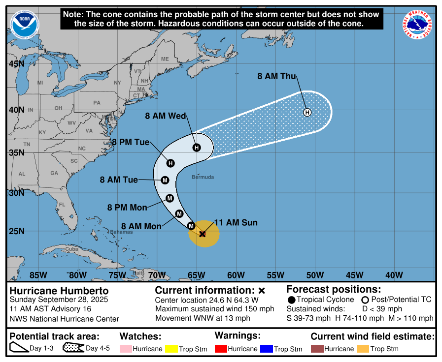 En cuanto al huracán Humberto, su centro se ubicó hoy a 720 kilómetros al norte de las Antillas Menores y a 855 kilómetros al sur de Bermuda.