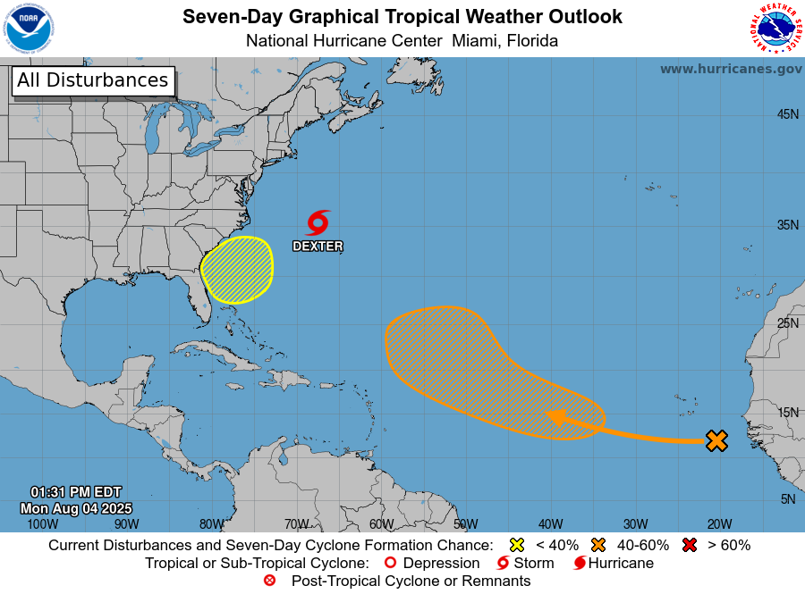 CHETUMAL, 4 de agosto.- En la noche del domingo se formó la tormenta tropical Dexter, cuarto ciclón con nombre de la temporada 2025 en el Atlántico, frente a la costa este de los Estados Unidos, por lo que no representa peligro para México, informó el Servicio Meteorológico Nacional (SMN).