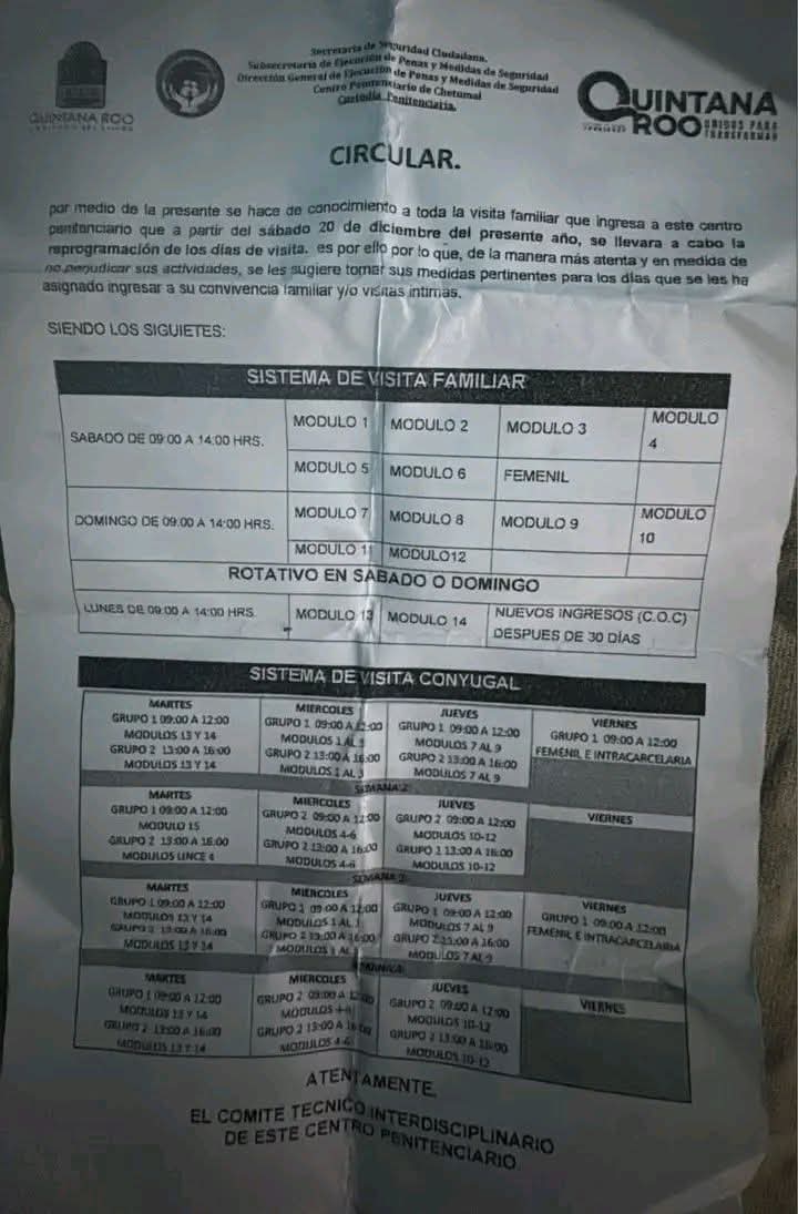 Horas más tarde, algunos lograron conocer un oficio interno en el que se informa que, a partir del día 20 del presente mes, el esquema de visitas será reorganizado por módulos y con ajustes en los horarios establecidos. Sin embargo, reprocharon que estas modificaciones no fueran notificadas con anticipación, lo que ocasionó confusión, pérdidas económicas y un trato que calificaron como arbitrario.