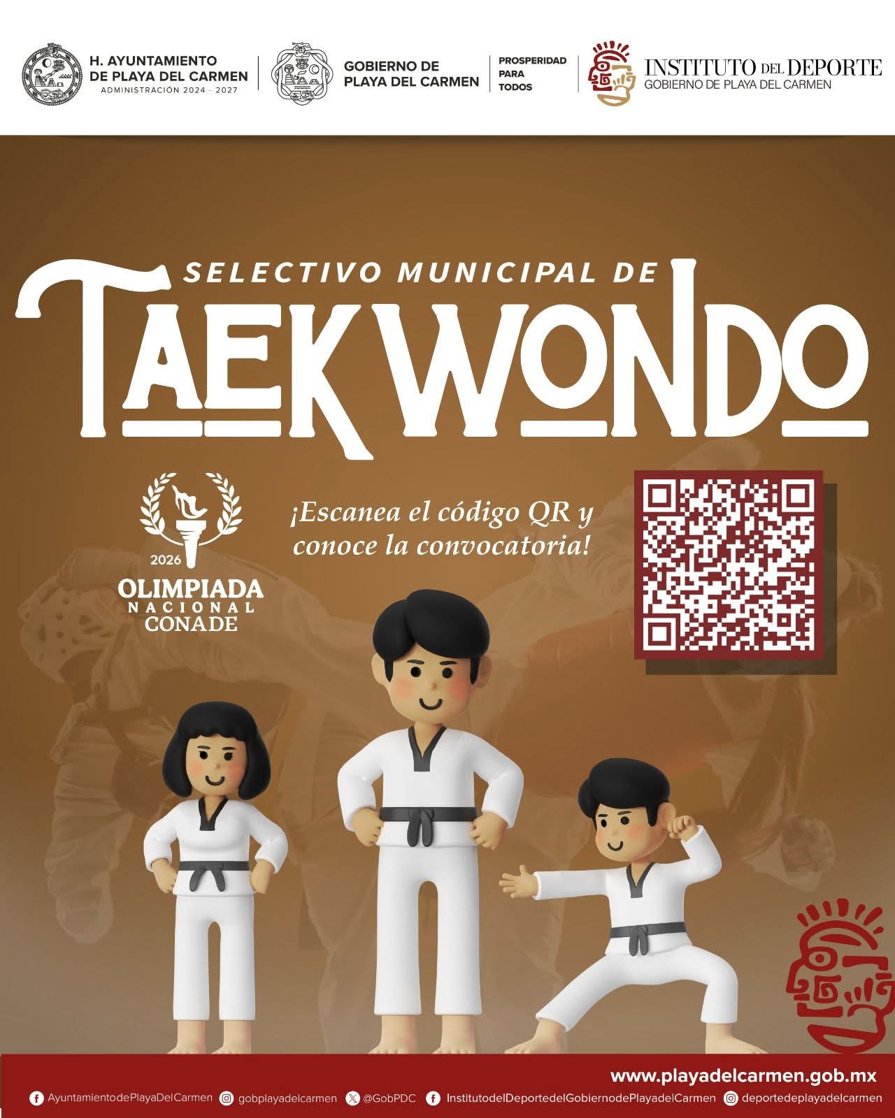 PLAYA DEL CARMEN, Q. ROO a 29 de octubre.- Será durante el segundo fin de semana de noviembre, cuando se llevó a cabo la etapa Municipal de Taekwondo, con la que niños, niñas y jóvenes playenses buscarán dar el primer paso con miras a poder representar al estado de Quintana Roo en las Olimpiadas Nacionales CONADE 2026, por lo cual el Instituto Municipal del Deporte de Playa del Carmen (IMDPC), ha lanzado la convocatoria para participar en dicha eliminatoria.