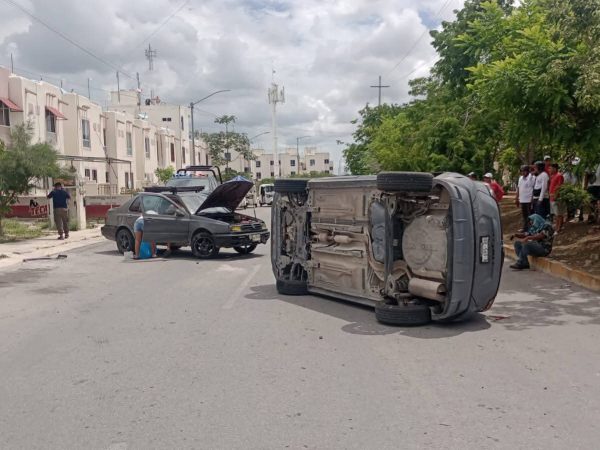 Aparatoso Accidente con Deja Auto Volcado en el Fraccionamiento Villas del Sol en Playa del Carmen