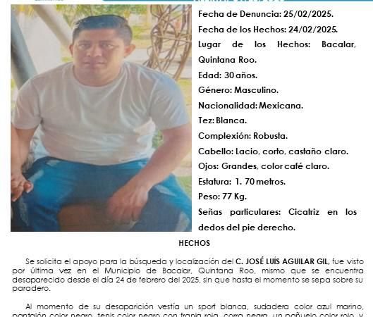 24 Feb. 2025► Hombre de 31 años, con cicatriz en la mejilla izquierda; autoridades piden apoyo ciudadano para localizarlo Antonio Briceño/CAMBIO 22 BACALAR, 24 de…