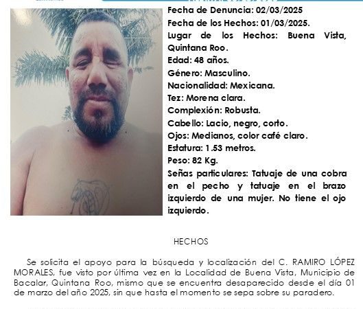 Activan Ficha de Búsqueda para Localizar a Ramiro López Morales en Bacalar