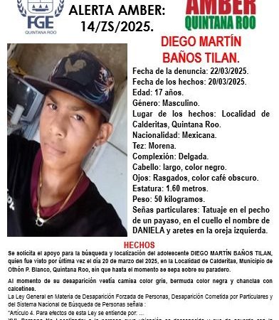 24 Mar. 2025► Diego Martín Baños Tilán, de 17 años, desapareció el pasado 20 de marzo en la localidad de Calderitas Antonio Briceño/CAMBIO 22 CHETUMAL,…