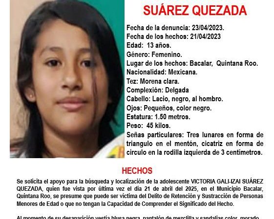 24 Abr. 2025Victoria Gali-Izian Suárez Quezada, de 13 años, fue vista por última vez el 21 de abril en Bacalar; la FGE presume que podría…