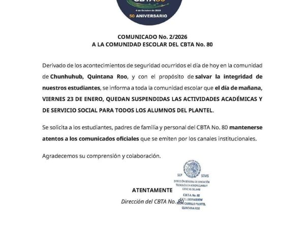 22 Ene. 2026Redacción/ CAMBIO 22 El Centro de Bachillerato Tecnológico Agropecuario (CBTA) No. 80 de la alcaldía de Chunhuhub suspendió clases y actividades para este…