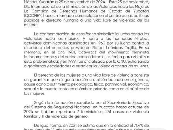 CODHEY Pide Poner en el Centro de las Políticas Públicas el Derecho a las Mujeres a Una Vida Libre de Violencia