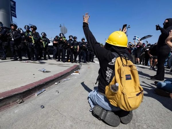 Un hombre es arrestado mientras manifestantes se enfrentan con las fuerzas del orden en las calles que rodean el edificio federal durante una protesta…