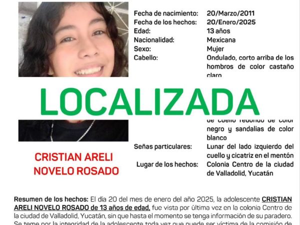 Localizan a Cristian Arely Novelo Rosado, Adolescente Desaparecida en Valladolid