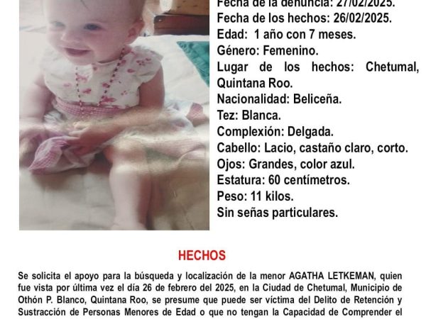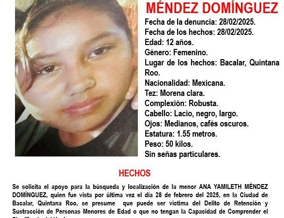 1 Mar. 2025► Menor de 12 años, desaparecida en Bacalar; autoridades piden apoyo ciudadano para encontrarla ► La denuncia fue presentada por familiares tras…