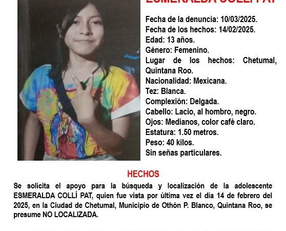 11 Mar. 2025► Esmeralda Collí Pat, de 13 años, fue vista por última vez el 14 de febrero de 2025 Antonio Briceño/CAMBIO 22 CHETUMAL, 11…