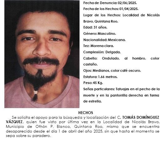3 Jun. 2025Tomás Domínguez Vázquez desapareció en abril tras llegar a trabajar en las obras del Tren Maya en Nicolás Bravo. Su madre y la…