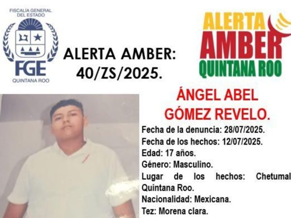 29 Jul. 2025Ángel Gómez Rebelo, de 17 años, fue reportado como desaparecido en Chetumal desde el 12 de julio; autoridades activaron alerta Amber y solicitan colaboración…