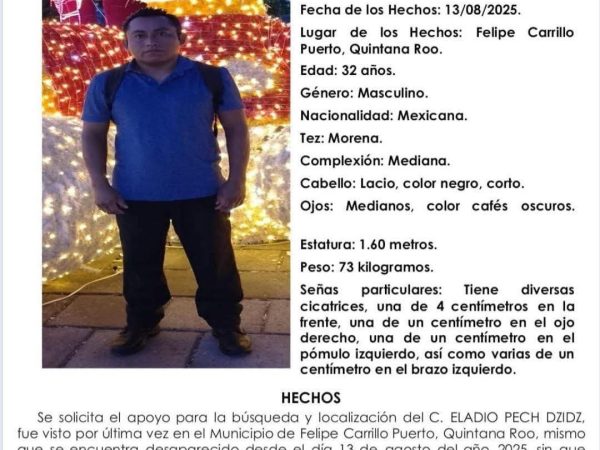 23 Jul. 2025Jesús Natanael López Tenorio, de 29 años, fue visto por última vez el 19 de julio en la comunidad de Pucté, en el municipio…
