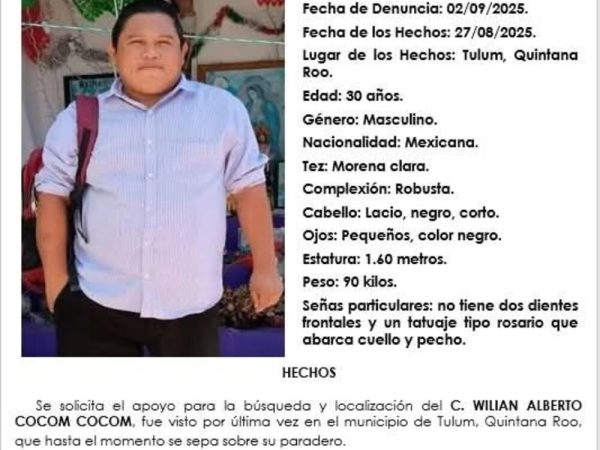 Activan Ficha de Búsqueda por la Desaparición de Wilian Cocom en Tulum