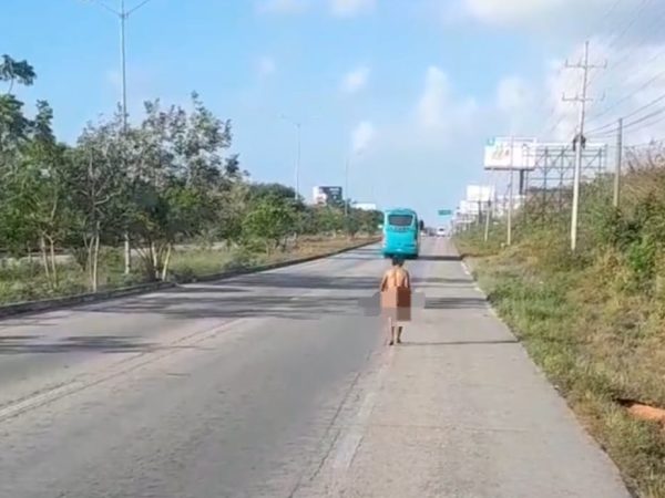 20 Abr. 2025Erik González/CAMBIO 22 Playa del Carmen, a 20 de abril.- Sujeto pasea desnudo por la carretera federal 307, esto a la altura del hotel…