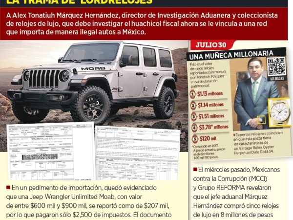 1 Ago. 2025Redacción/CAMBIO 22 Alex Tonatiuh Márquez Hernández, funcionario de alto nivel de la Agencia Nacional de Aduanas de México (ANAM), conocido como “LordRelojes”, es señalado…