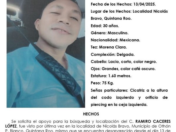 15 Abr. 2025La Fiscalía activó fichas de búsqueda por la desaparición de Jesús Correa en Cacao y Ramiro Cáceres en Nicolás Bravo. Se pide apoyo…