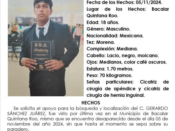 10 Nov. 2024La Fiscalía General del Estado de Quintana Roo emitió una ficha de búsqueda para localizar a Gerardo Sánchez Juárez, de 18 años, desaparecido…