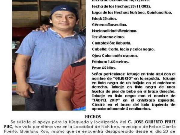 11 Dic. 2025De acuerdo con la denuncia presentada el 10 de diciembre, Pérez Puc fue visto por última vez en dicha localidad sin que, hasta ahora,…