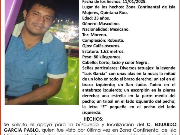 17 Ene. 2025Redacción/CAMBIO 22 ISLA MUJERES, Q.ROO, 17 de enero-. La Fiscalía General de Quintana Roo activó una ficha de búsqueda para localizar a Eduardo García…