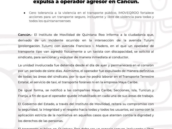 IMOVEQROO Expulsa a Operador Agresor y Ratifica Política de Cero Tolerancia a la Violencia