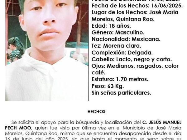 17 Jun. 2025Redacción / CAMBIO 22 José María Morelos, 17 de junio.- Aunque la Fiscalía continúa con la búsqueda activa de Jesús Manuel Pech Moo, uno…
