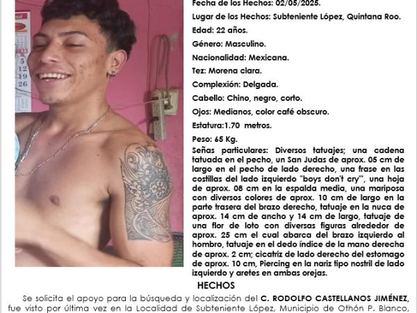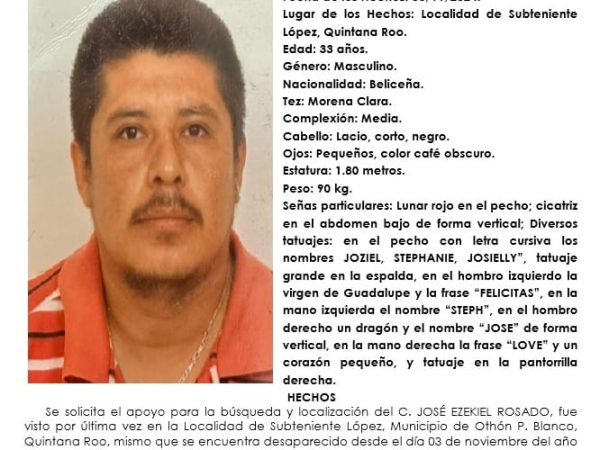 6 Nov. 2024► José Ezekiel Rosado, de 33 años, fue reportado desaparecido el 3 de noviembre Antonio Briceño/CAMBIO 22 CHETUMAL, 6 de noviembre.- La Fiscalía…