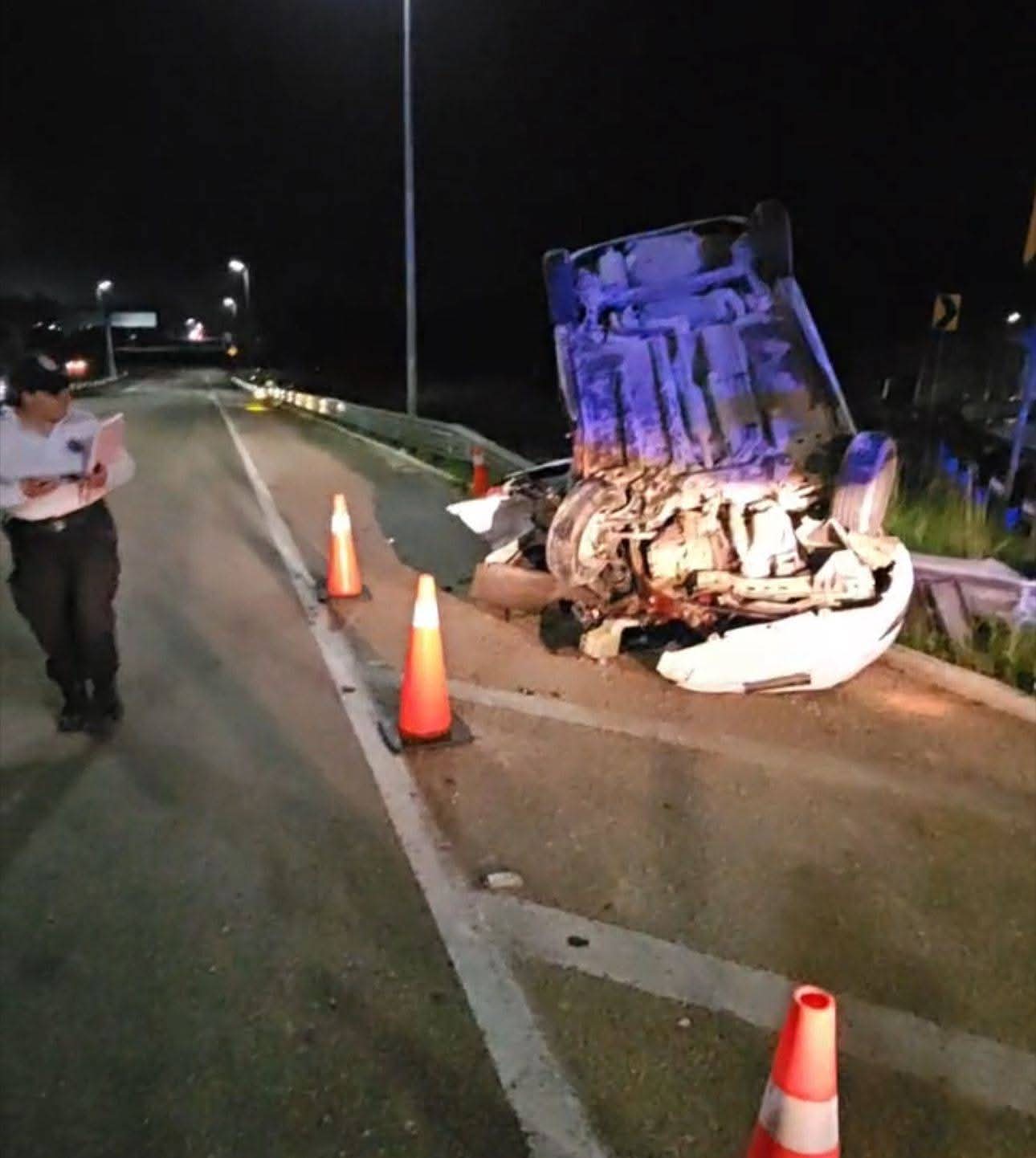 FELIPE CARRILLO PUERTO a 10 de octubre .– Un taxi terminó volcado luego de impactarse contra un muro de contención en el puente de salida hacia Mérida, en un accidente ocurrido la noche de este jueves, minutos antes de las 23:00 horas.