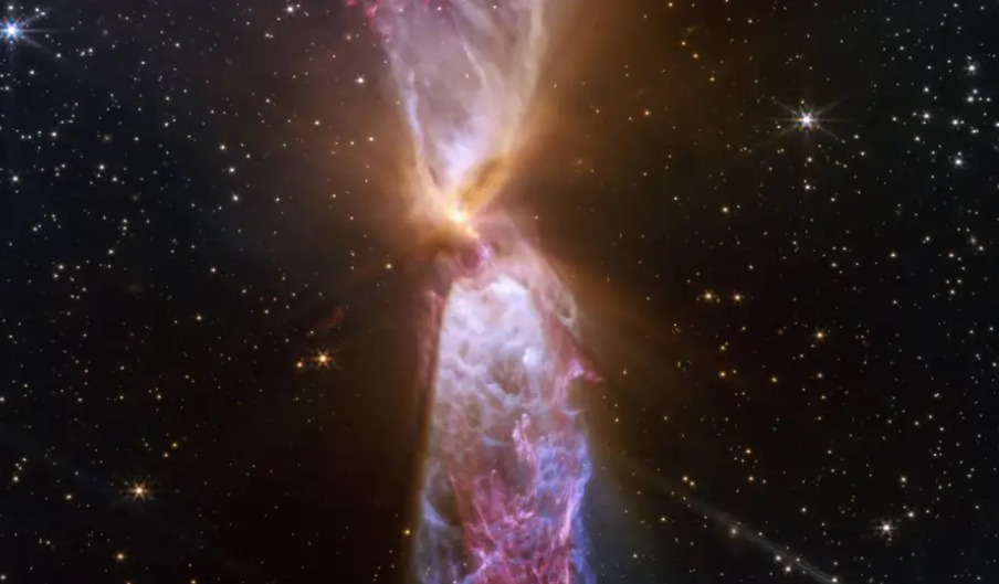Una protoestrella es una condensación de gas y polvo interestelar cuya atracción gravitatoria hace que colapse sobre sí misma y forme una estrella. Las dos protoestrellas responsables de esta escena capturada por el Webb se encuentran en el centro del reloj de arena. A lo largo de decenas de miles de años, estas han expulsado periódicamente parte del gas y el polvo, arrojándolo en forma de chorros rápidos y compactos, y de flujos ligeramente más lentos que ‘viajan’ por el espacio. Cuando las eyecciones más recientes chocan con las más antiguas, el material puede ‘arrugarse’ y girar en función de las densidades de lo que colisiona. Con el tiempo, las reacciones químicas en el interior de estas eyecciones y en la nube circundante producen una serie de moléculas, como monóxido de carbono, metanol y otros compuestos orgánicos.