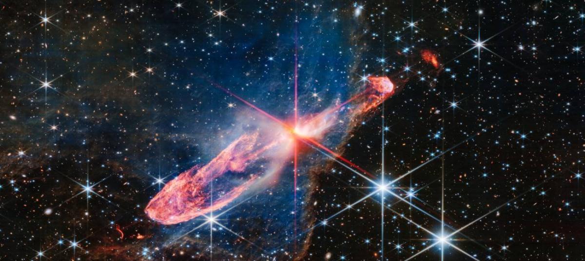 Una protoestrella es una condensación de gas y polvo interestelar cuya atracción gravitatoria hace que colapse sobre sí misma y forme una estrella. Las dos protoestrellas responsables de esta escena capturada por el Webb se encuentran en el centro del reloj de arena. A lo largo de decenas de miles de años, estas han expulsado periódicamente parte del gas y el polvo, arrojándolo en forma de chorros rápidos y compactos, y de flujos ligeramente más lentos que ‘viajan’ por el espacio. Cuando las eyecciones más recientes chocan con las más antiguas, el material puede ‘arrugarse’ y girar en función de las densidades de lo que colisiona. Con el tiempo, las reacciones químicas en el interior de estas eyecciones y en la nube circundante producen una serie de moléculas, como monóxido de carbono, metanol y otros compuestos orgánicos.