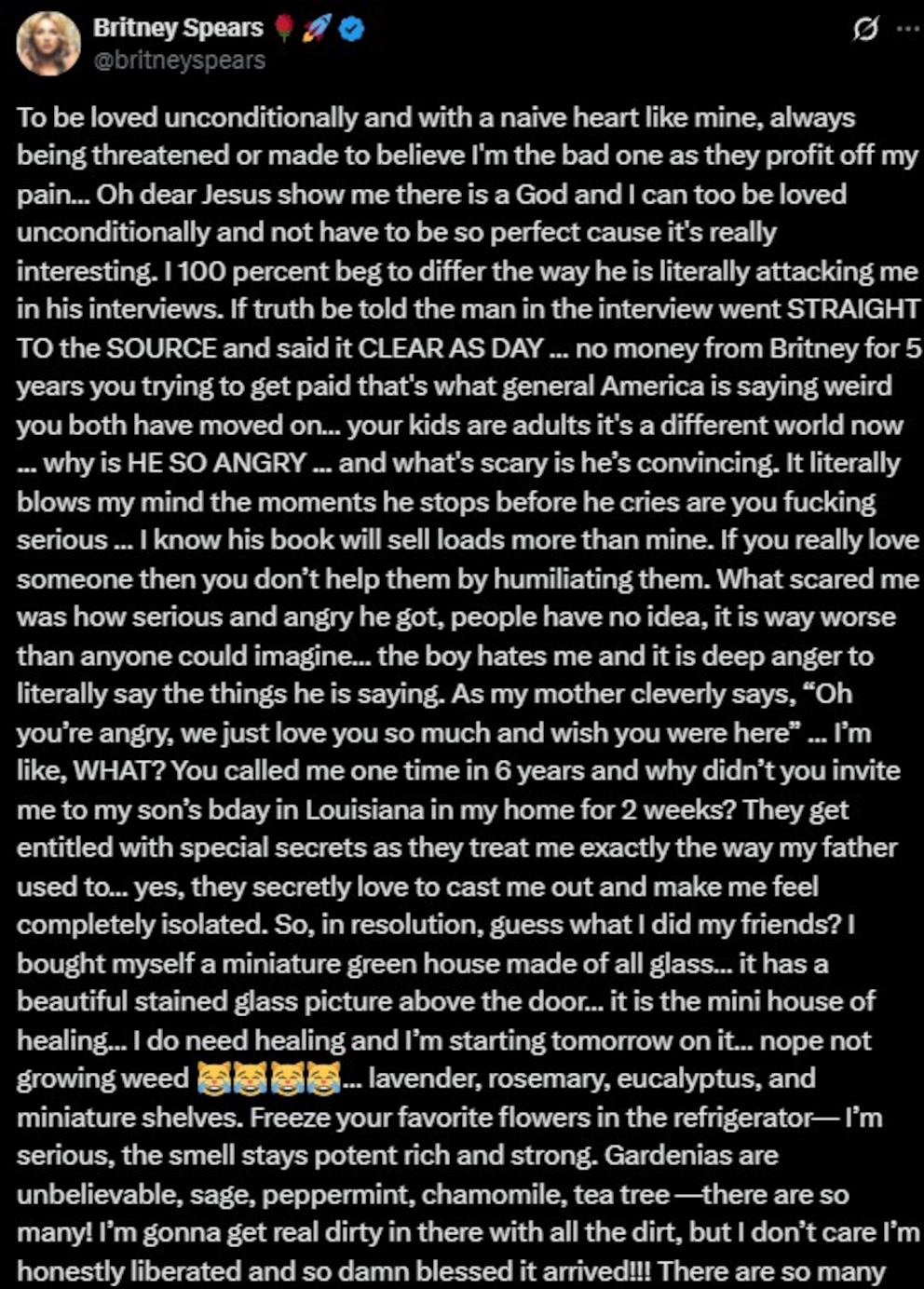 A pesar del tono de frustración que domina sus publicaciones, la recordada “princesa del pop” reveló que está manteniéndose activa con el fin de sanar. Por ejemplo, recientemente compró un pequeño invernadero como parte de su proceso de recuperación emocional.